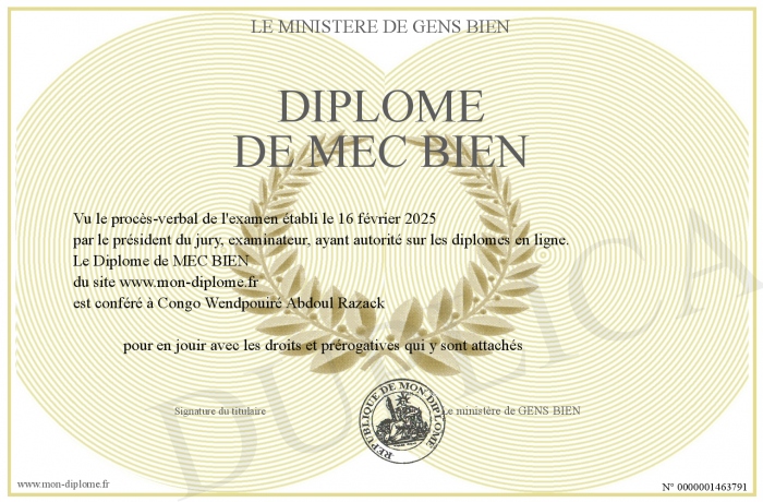 Envoyez par email votre Diplôme de MEC BIEN personalisé