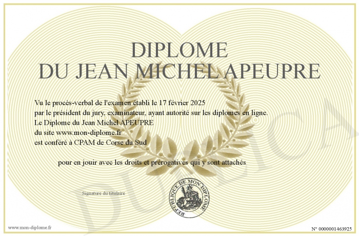 Envoyez par email votre Diplôme du Jean Michel APEUPRE personalisé
