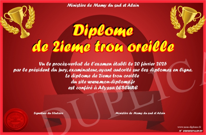 Envoyez par email votre Diplome de 2ieme trou oreille personalisé