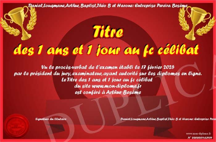 Envoyez par email votre Titre des 1 ans et 1 jour au fc célibat personalisé