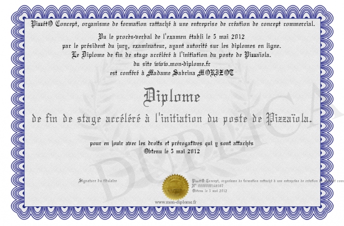 Envoyez par email votre Diplôme de fin de stage accéléré à l'initiation du poste de Pizzaïola. personalisé