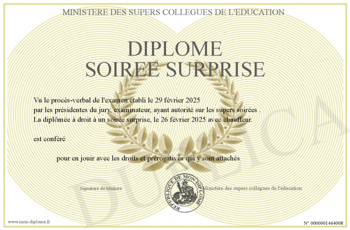 Envoyez par email votre Diplôme soirée surprise personalisé