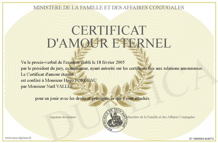 Envoyez par email votre Certificat d'amour éternel personalisé