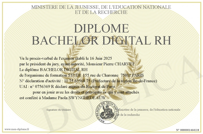 Envoyez par email votre Diplôme BACHELOR DIGITAL RH personalisé
