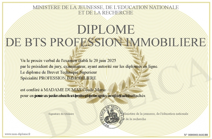 Envoyez par email votre Diplôme de BTS PROFESSION IMMOBILIERE personalisé