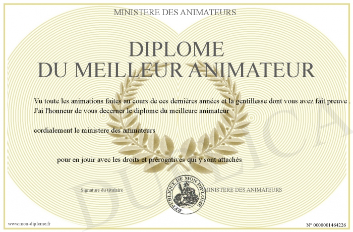 Envoyez par email votre DiplôME DU MEILLEUR ANIMATEUR personalisé