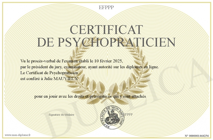 Envoyez par email votre Certificat de Psychopraticien personalisé