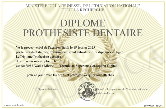 Envoyez par email votre Diplôme Prothésiste dentaire personalisé