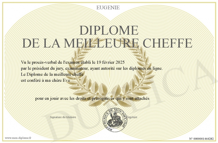 Envoyez par email votre Diplôme de la meilleure cheffe personalisé