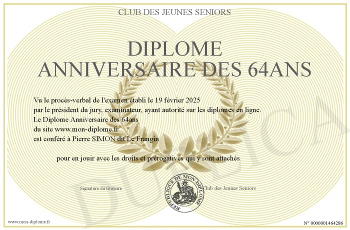 Envoyez par email votre Diplôme Anniversaire des 64ans personalisé