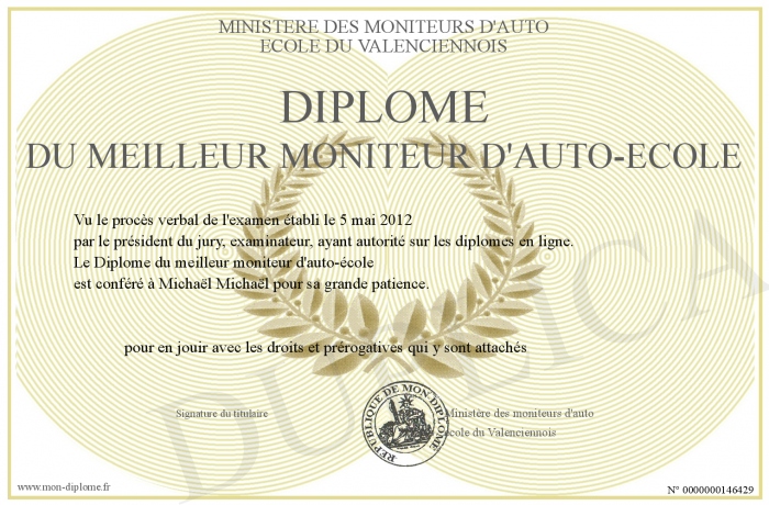 Envoyez par email votre Diplôme du meilleur moniteur d'auto-école personalisé