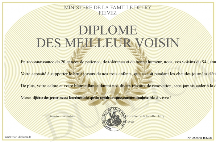 Envoyez par email votre Diplôme des meilleur voisin personalisé