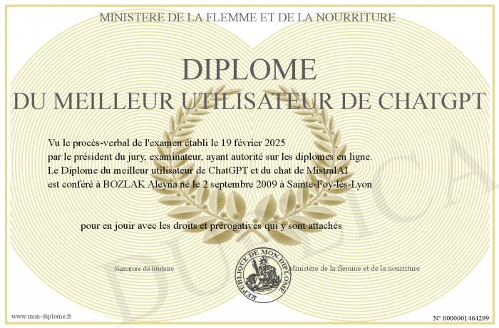 Envoyez par email votre Diplôme du meilleur utilisateur de ChatGPT personalisé