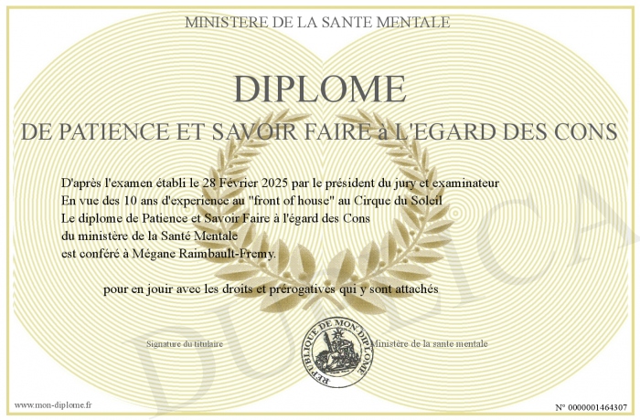 Envoyez par email votre Diplôme de patience et savoir faire à l'égard des cons personalisé