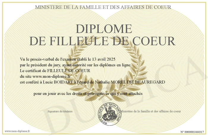 Envoyez par email votre Diplôme de filleule de coeur personalisé