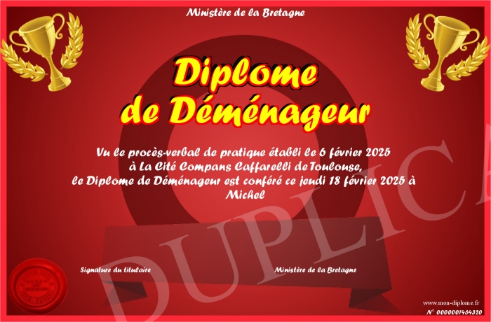 Envoyez par email votre Diplôme de Déménageur personalisé