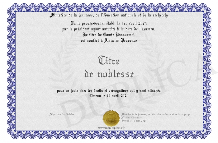 Envoyez par email votre Titre de noblesse personalisé