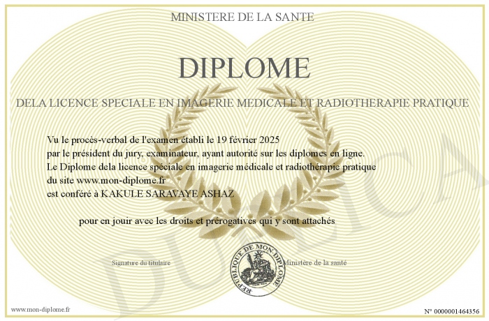 Envoyez par email votre Diplôme dela licence spéciale en imagerie médicale et radiothérapie pratique personalisé
