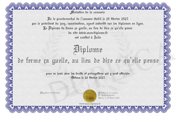 Envoyez par email votre Diplôme de ferme ça guelle, au lieu de dire ce qu'elle pense personalisé