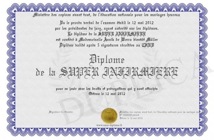 Envoyez par email votre Diplôme de la SUPER INFIRMIERE personalisé