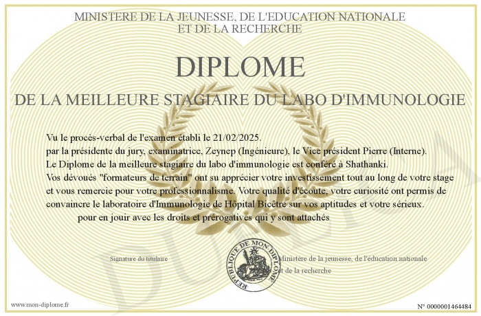 Envoyez par email votre Diplôme de la meilleure stagiaire du labo d'immunologie personalisé
