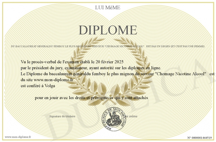 Envoyez par email votre Diplôme du baccalaureat généraldu femboy le plus mignon du serveur -Chômage Nicotine Alcool- est pas un degen (et c'est pas une femme) personalisé
