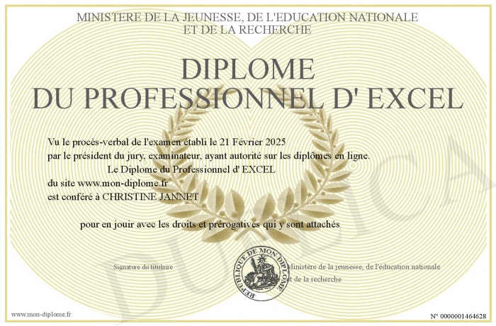 Envoyez par email votre Diplôme du Professionnel d' EXCEL personalisé
