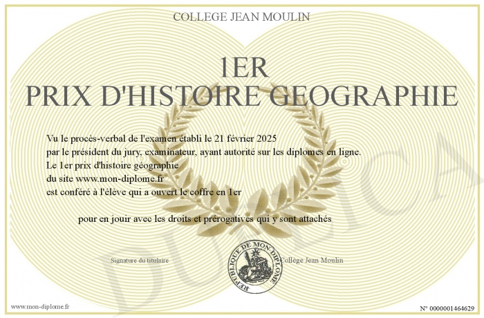 Envoyez par email votre 1er prix d'histoire géographie personalisé