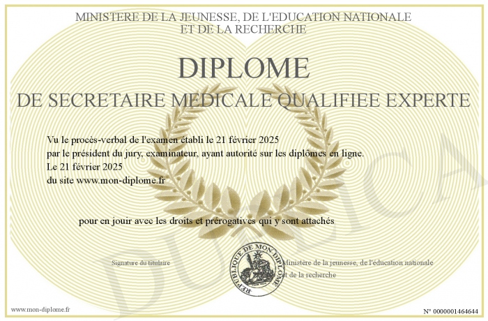 Envoyez par email votre Diplôme de Secrétaire Médicale Qualifiée Experte personalisé