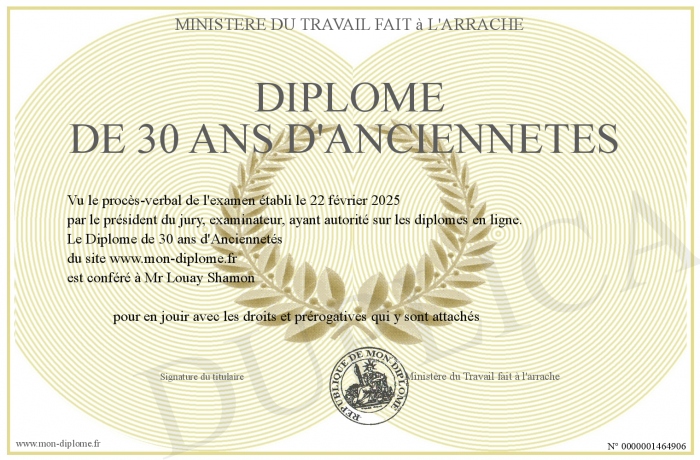 Envoyez par email votre Diplôme de 30 ans d'Anciennetés personalisé