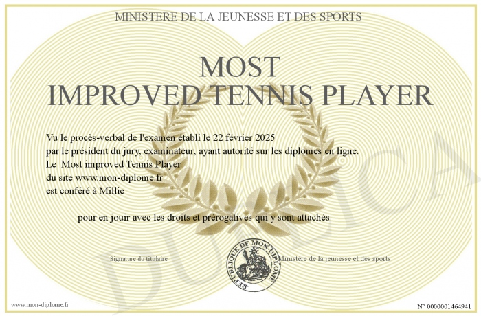 Envoyez par email votre Most improved Tennis Player personalisé
