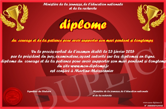 Envoyez par email votre diplome du courage et de la patience pour avoir supporter son mari pendant si longtemps personalisé