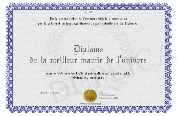 Envoyez par email votre Diplôme de la meilleur mamie de l'univers personalisé