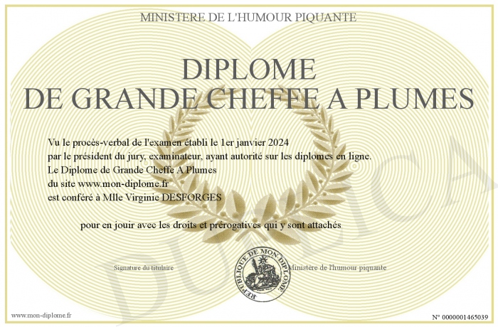 Envoyez par email votre Diplôme de Grande Cheffe A Plumes personalisé