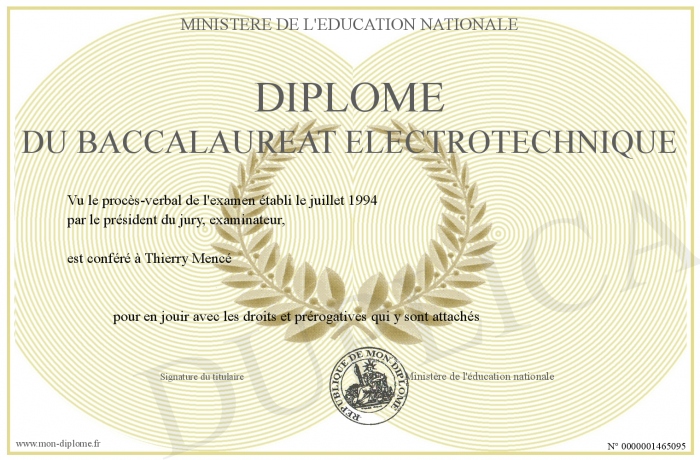 Envoyez par email votre Diplôme du baccalauréat électrotechnique personalisé