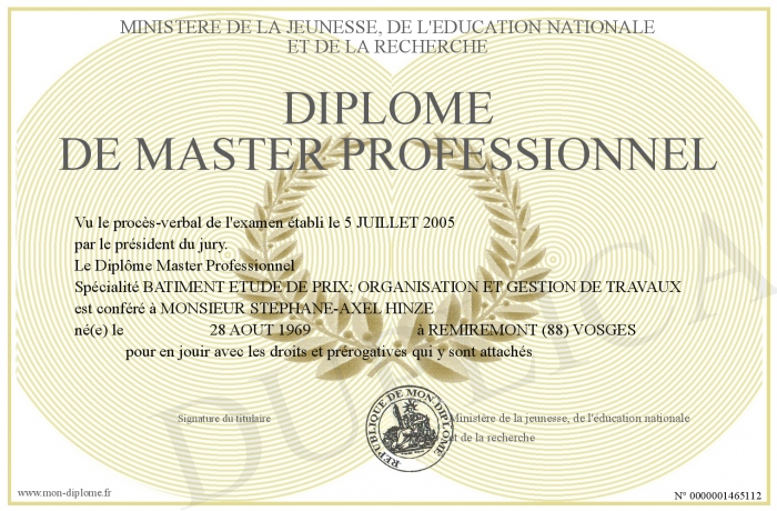Envoyez par email votre Diplôme de master Professionnel personalisé