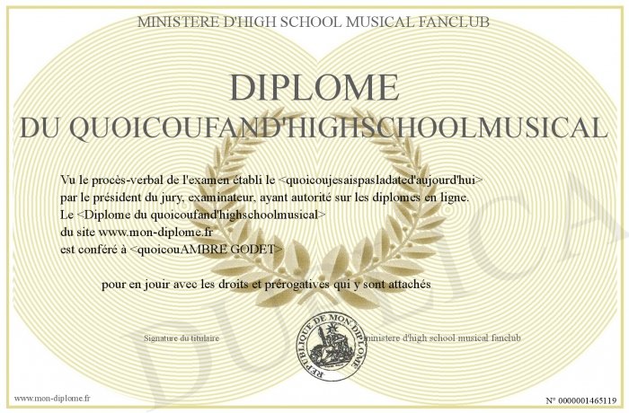 Envoyez par email votre Diplôme du quoicoufand'highschoolmusical personalisé