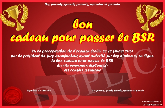 Envoyez par email votre bon cadeau pour passer le BSR personalisé