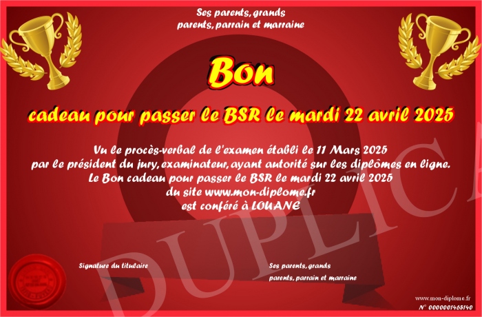 Envoyez par email votre Bon cadeau pour passer le BSR le mardi 22 avril 2025 personalisé