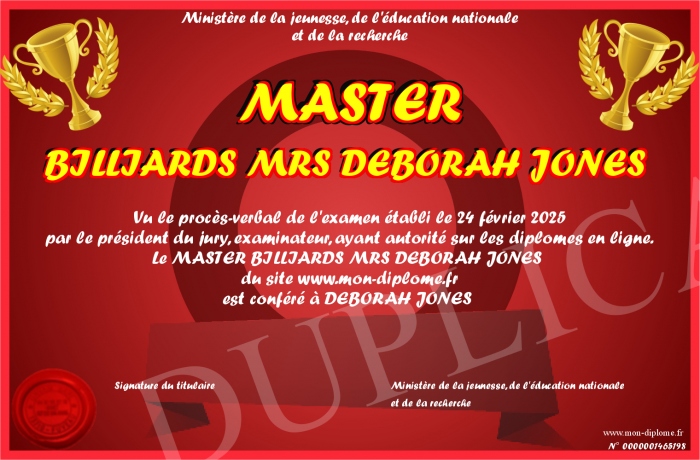 Envoyez par email votre MASTER BILLIARDS MRS DEBORAH JONES personalisé