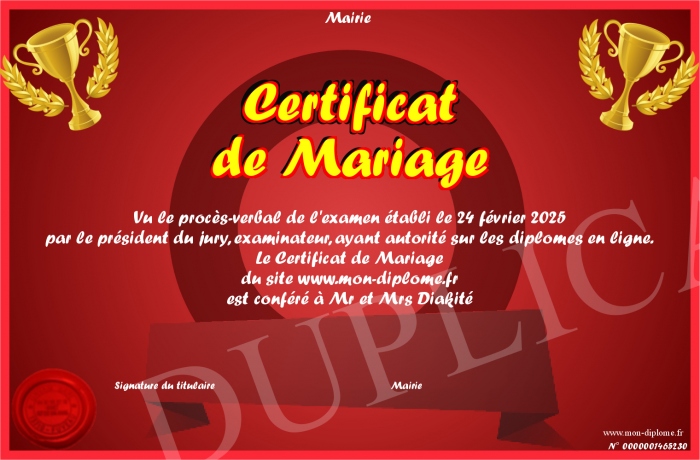 Envoyez par email votre Certificat de Mariage personalisé