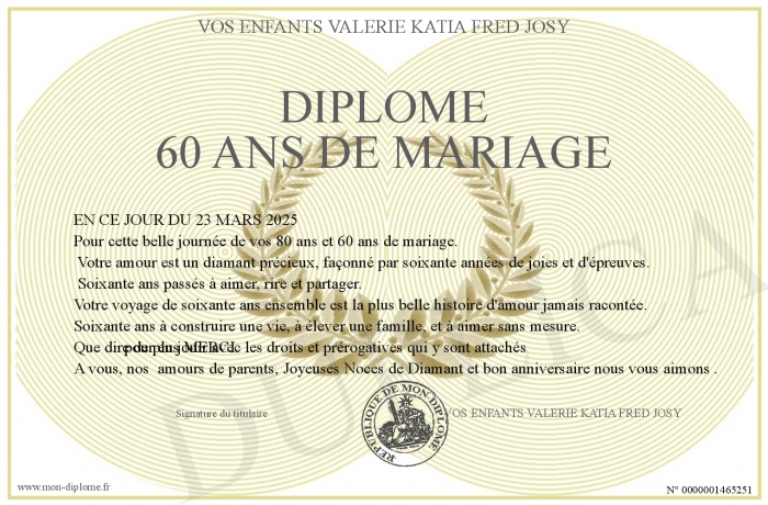 Envoyez par email votre diplôme 60 ans de mariage personalisé