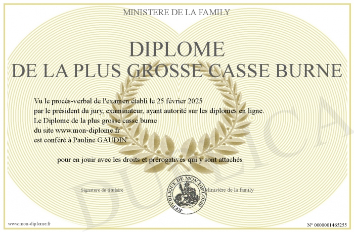 Envoyez par email votre Diplôme de la plus grosse casse burne personalisé