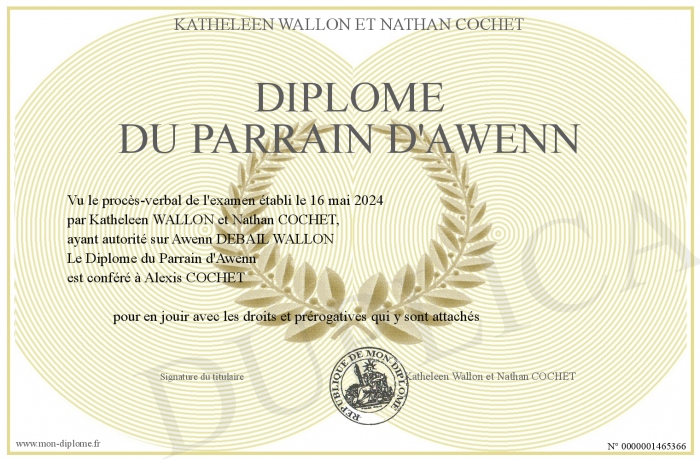 Envoyez par email votre Diplome du Parrain d'Awenn personalisé