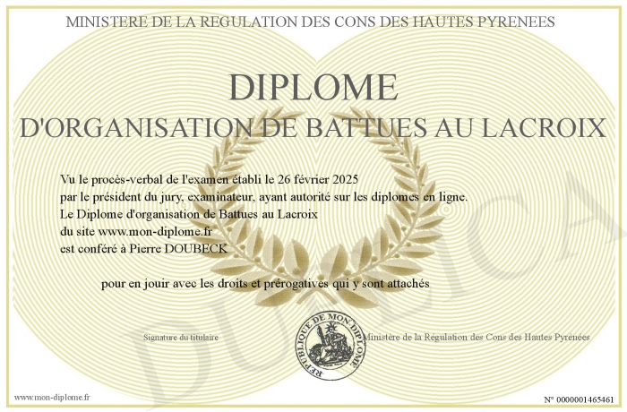 Envoyez par email votre Diplôme d'organisation de Battues au Lacroix personalisé