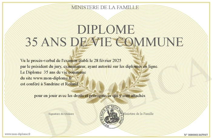 Envoyez par email votre Diplôme 35 ans de vie commune personalisé