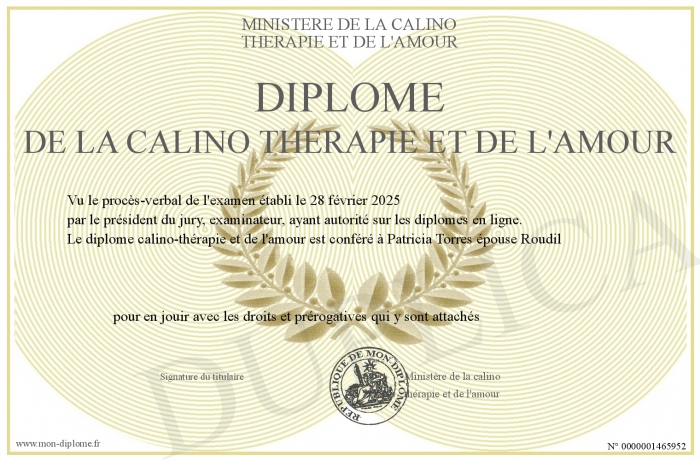 Envoyez par email votre Diplôme de la calino thérapie et de l'amour personalisé