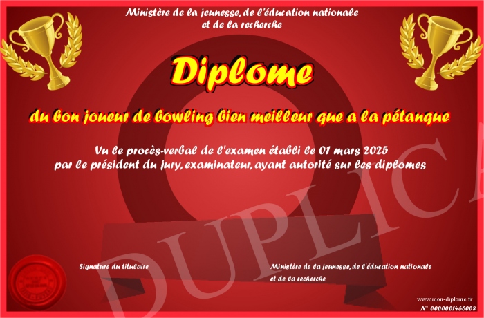 Envoyez par email votre Diplôme du bon joueur de bowling bien meilleur que a la pétanque personalisé