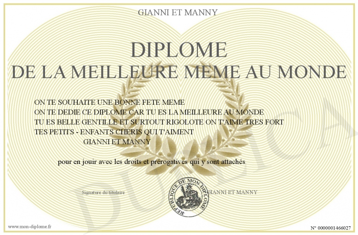 Envoyez par email votre DIPLOME DE LA MEILLEURE MEME AU MONDE personalisé