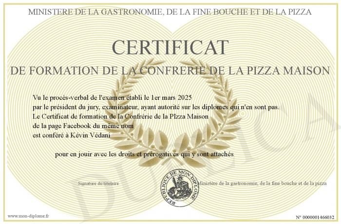 Envoyez par email votre Certificat de formation de la Confrérie de la PIzza Maison personalisé